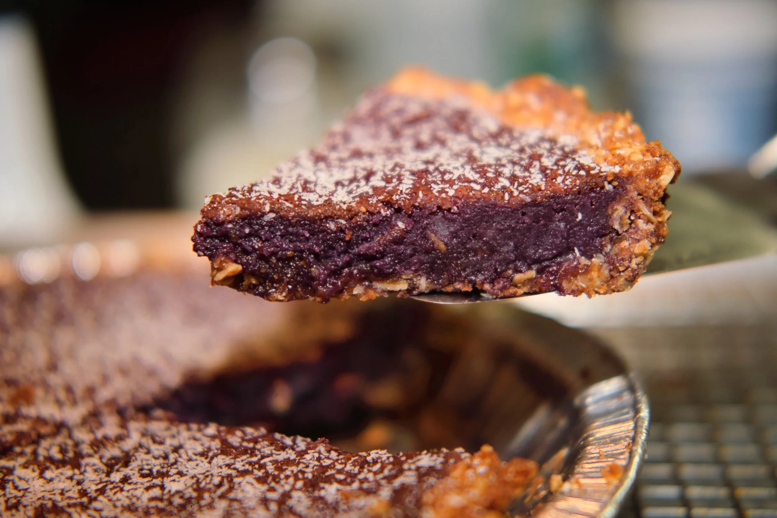 Ube Cake: ube pudding, toasted coconut curds, and coconut buttercream frosting
